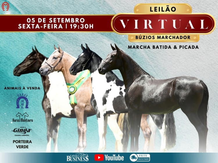 A Business Leilões realizará no dia 05 de SETEMBRO de 2025 as 19h30min o LEILÃO BÚZIOS MANGALARGA MARCHADOR. No leilão, serão ofertados 25 animais entre Coberturas, Embriões, Garanhões, Doadoras, Matrizes, Potras e Potros da Raça Mangalarga Marchador, todos rigorosamente selecionados, com alta carga genética e retirados da cabeceira de criadores do RJ, SP, MG e BA.